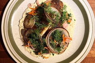 Blackened Walleye with Remoulade, Charred Onion, Pickled Slaw & Dill